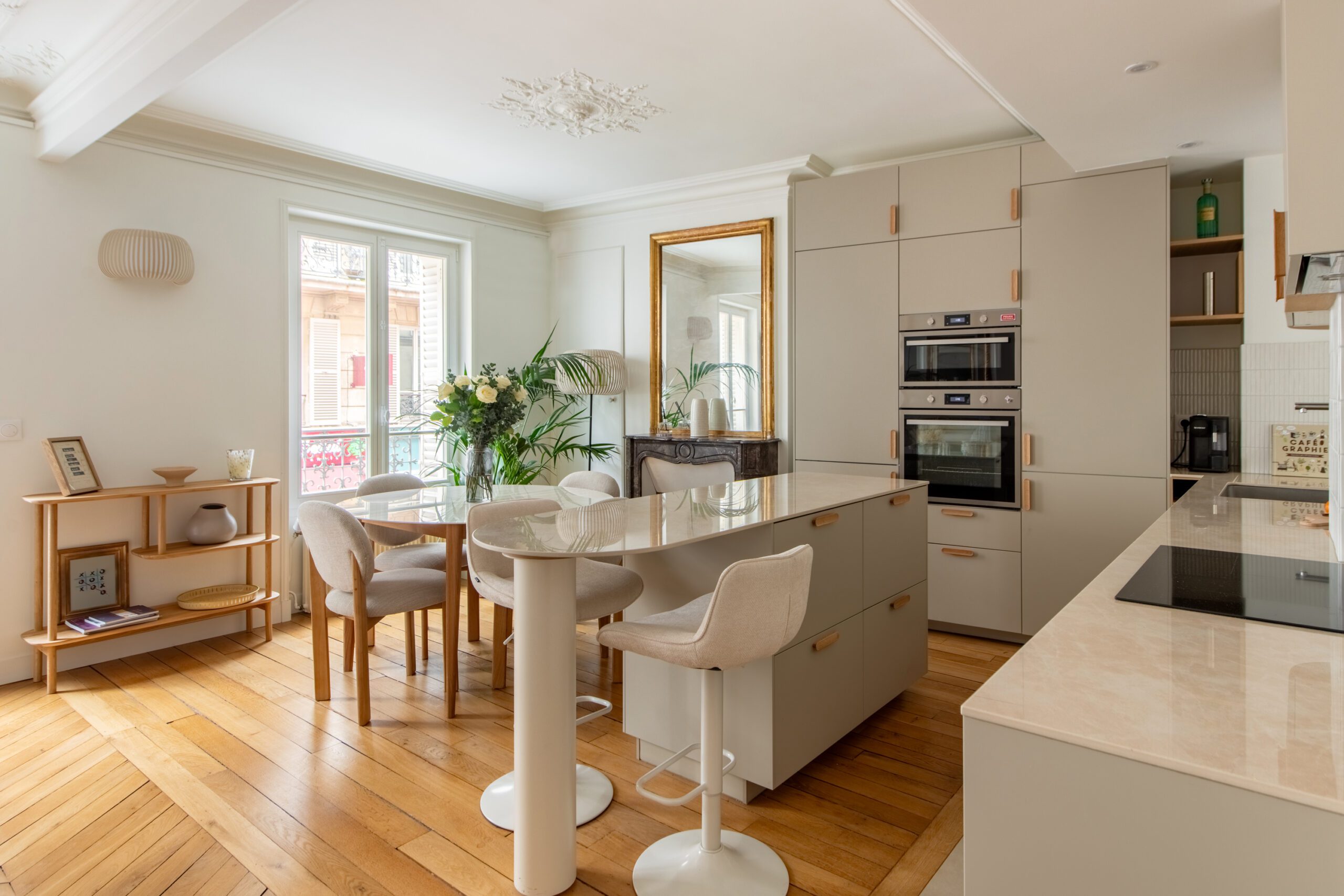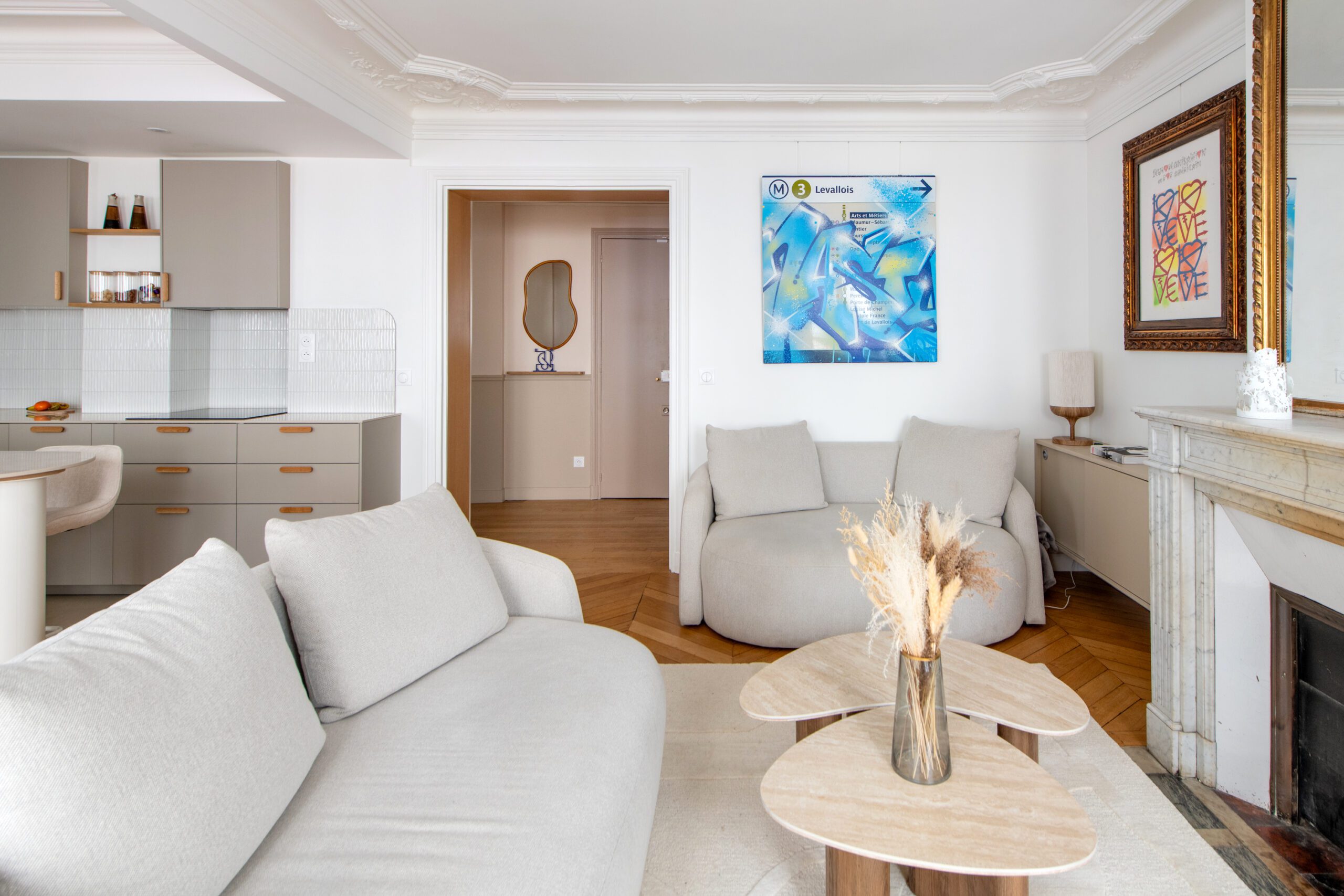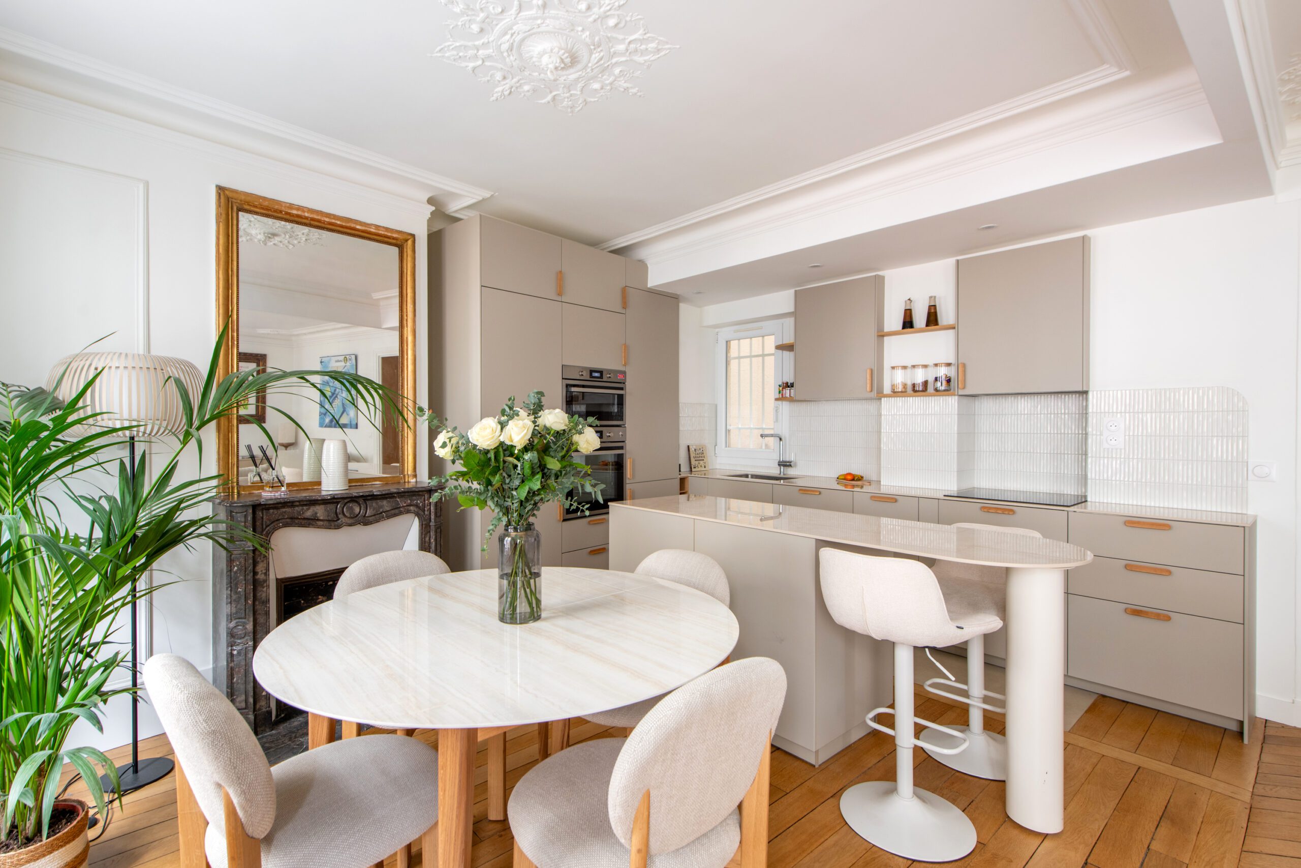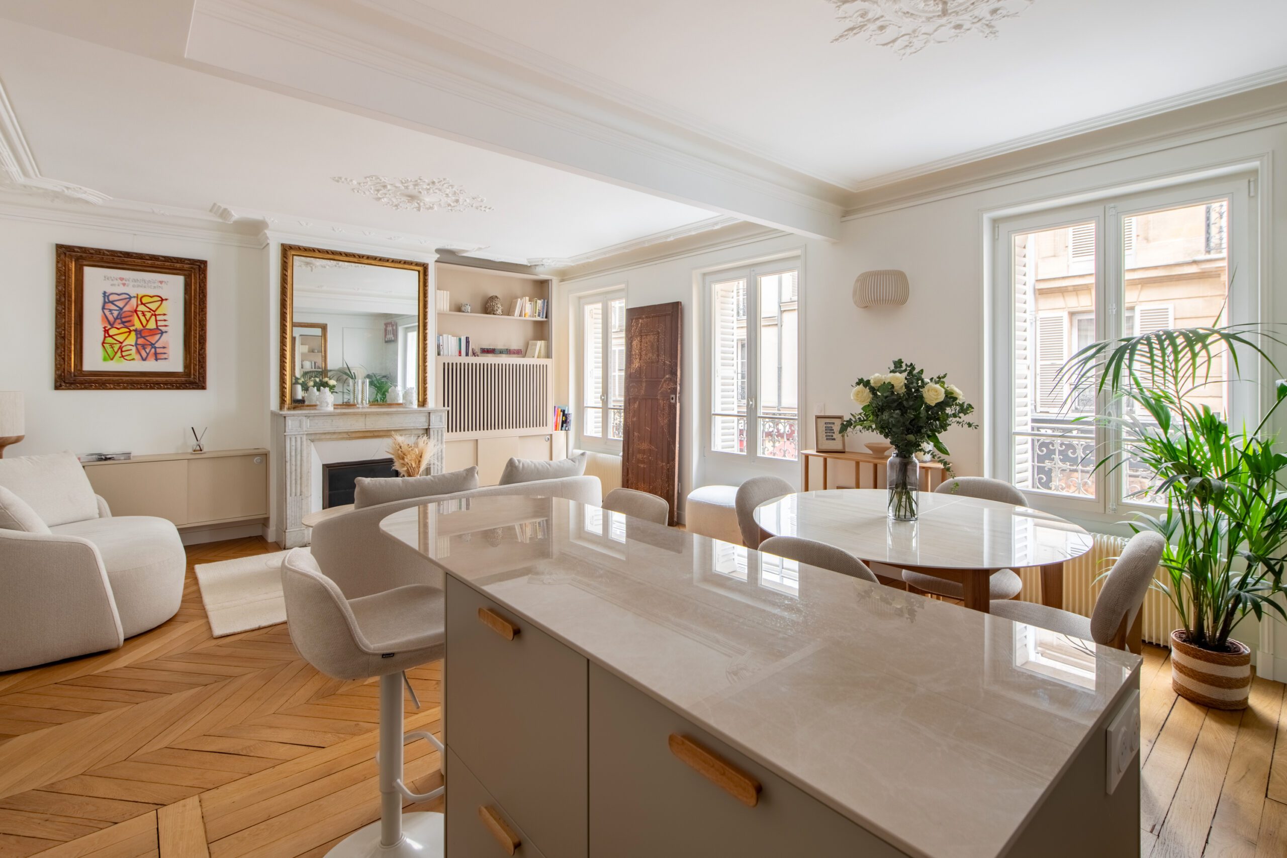 L’espace de cet appartement doit être repensé afin de créer (i) un séjour avec cuisine ouverte intégrant une table dinatoire extensible et un coin bar, ainsi que (ii) deux vraies chambres avec des rangements, dont l’une avec un coin bureau, (iii) tout en conservant la salle de bain avec douche et baignoire, le tout dans des tons neutres et intemporels