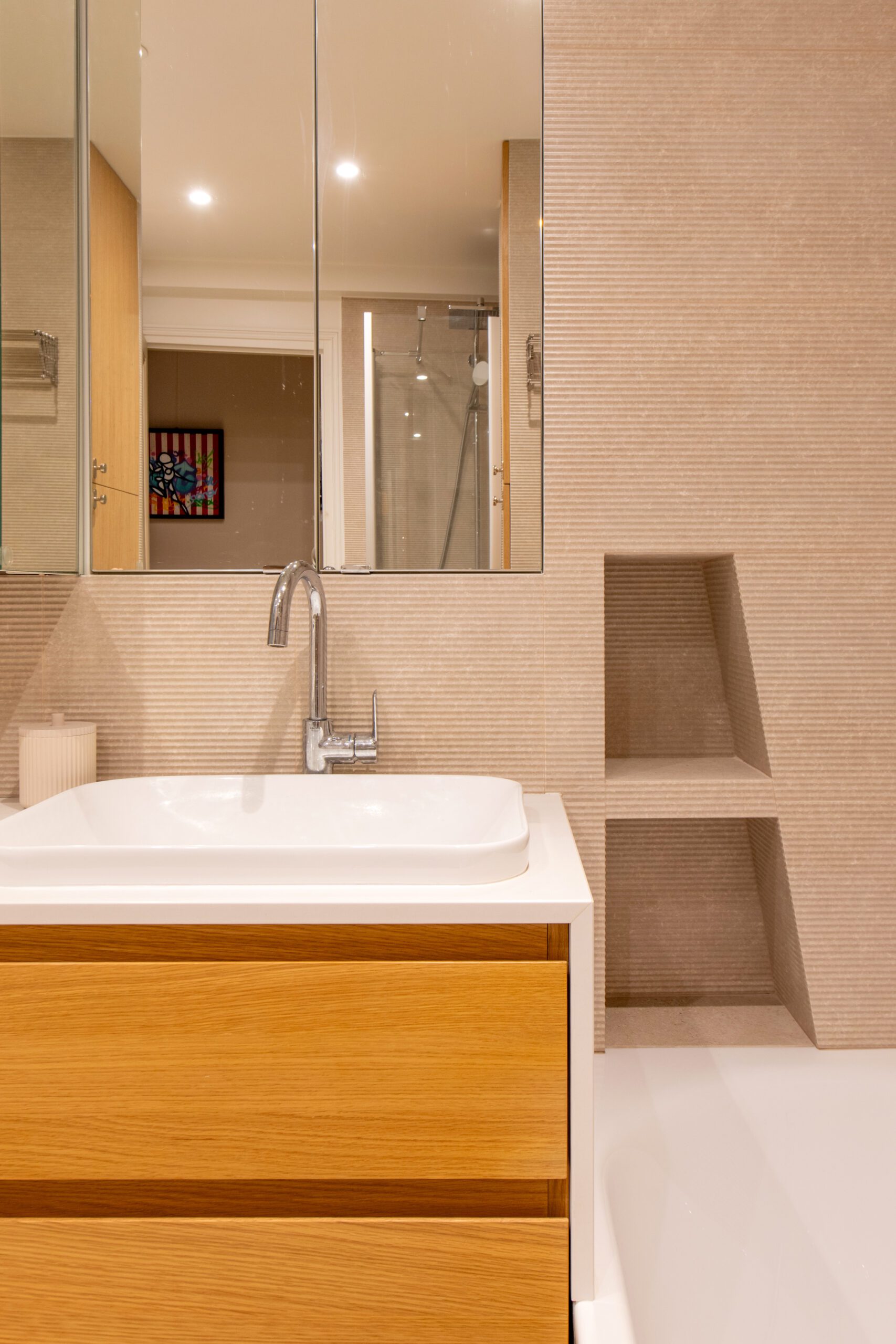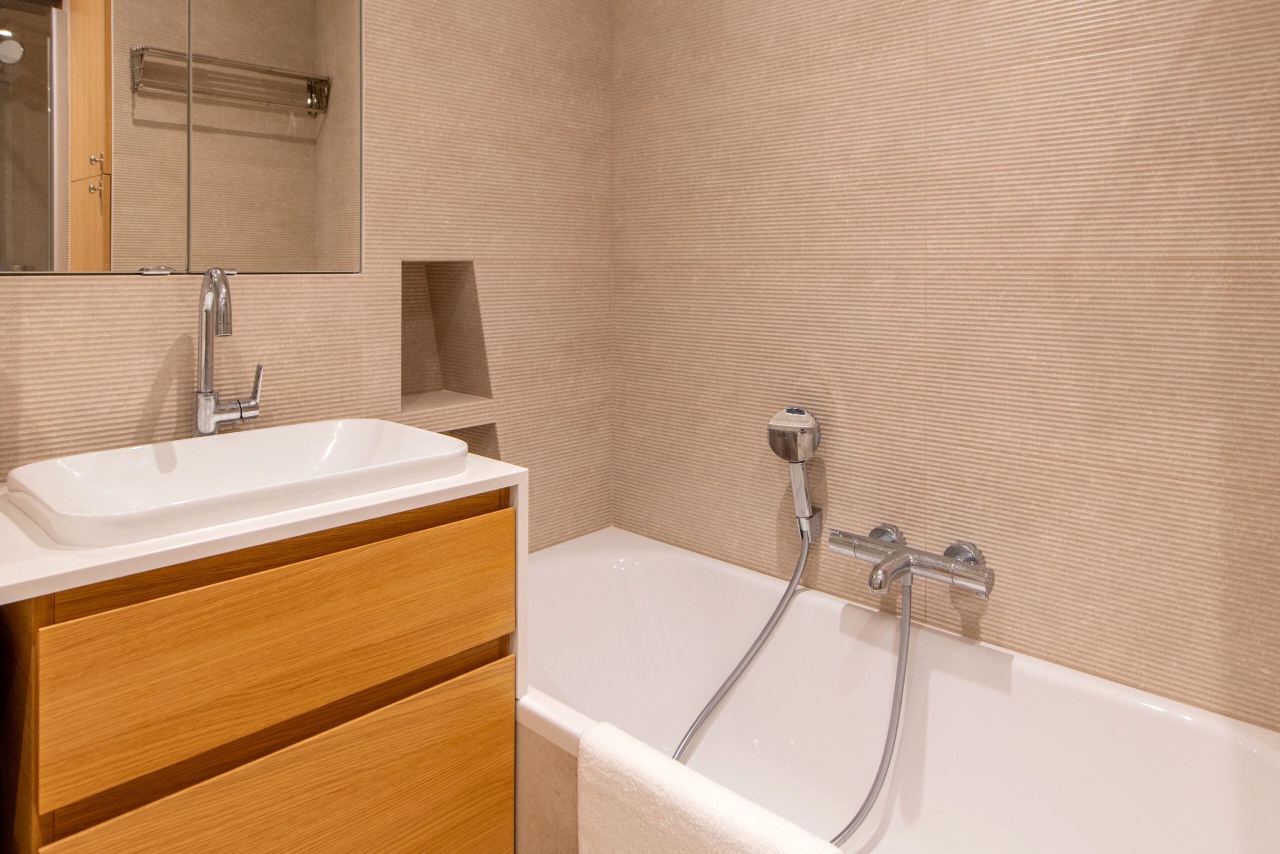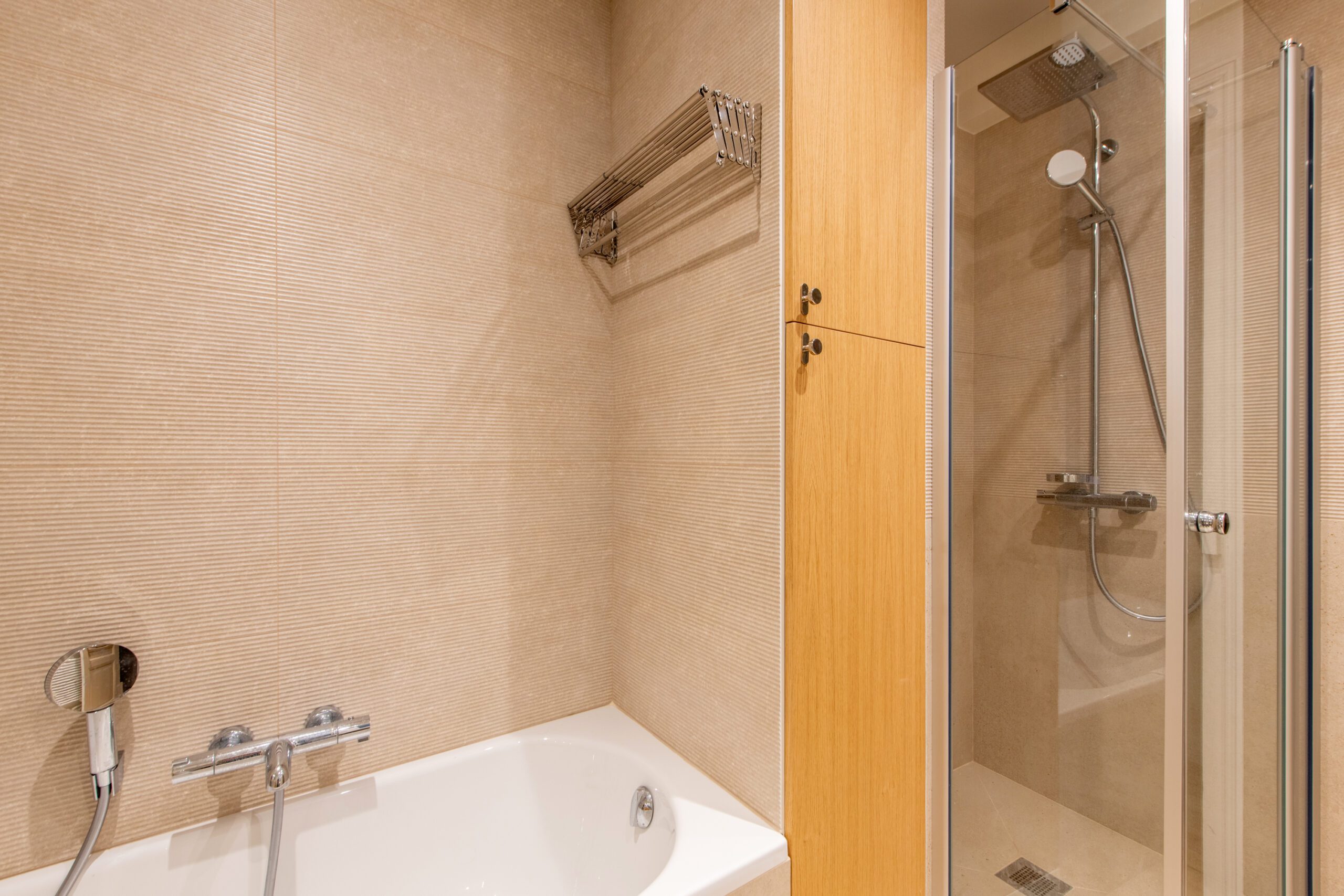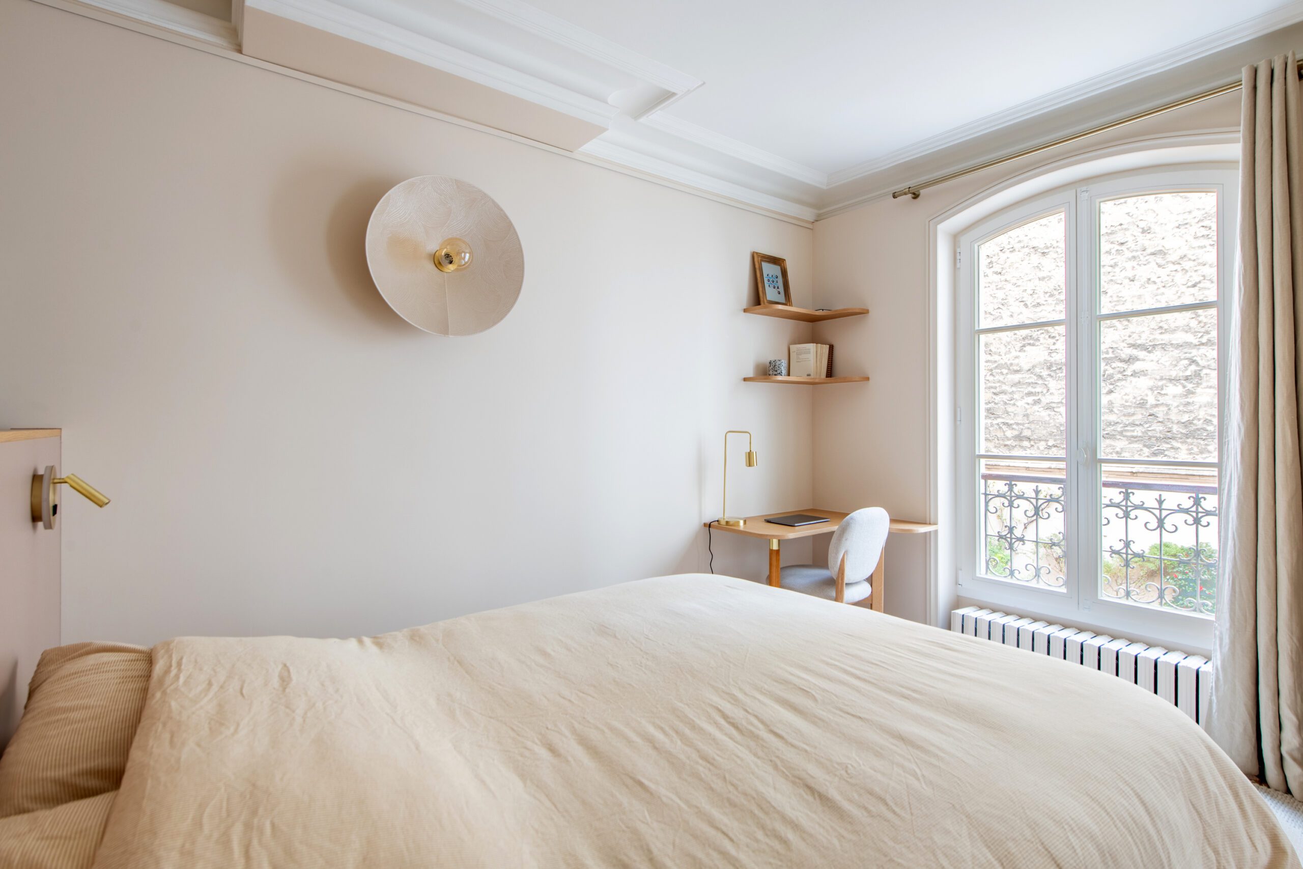 L’espace de cet appartement doit être repensé afin de créer (i) un séjour avec cuisine ouverte intégrant une table dinatoire extensible et un coin bar, ainsi que (ii) deux vraies chambres avec des rangements, dont l’une avec un coin bureau, (iii) tout en conservant la salle de bain avec douche et baignoire, le tout dans des tons neutres et intemporels